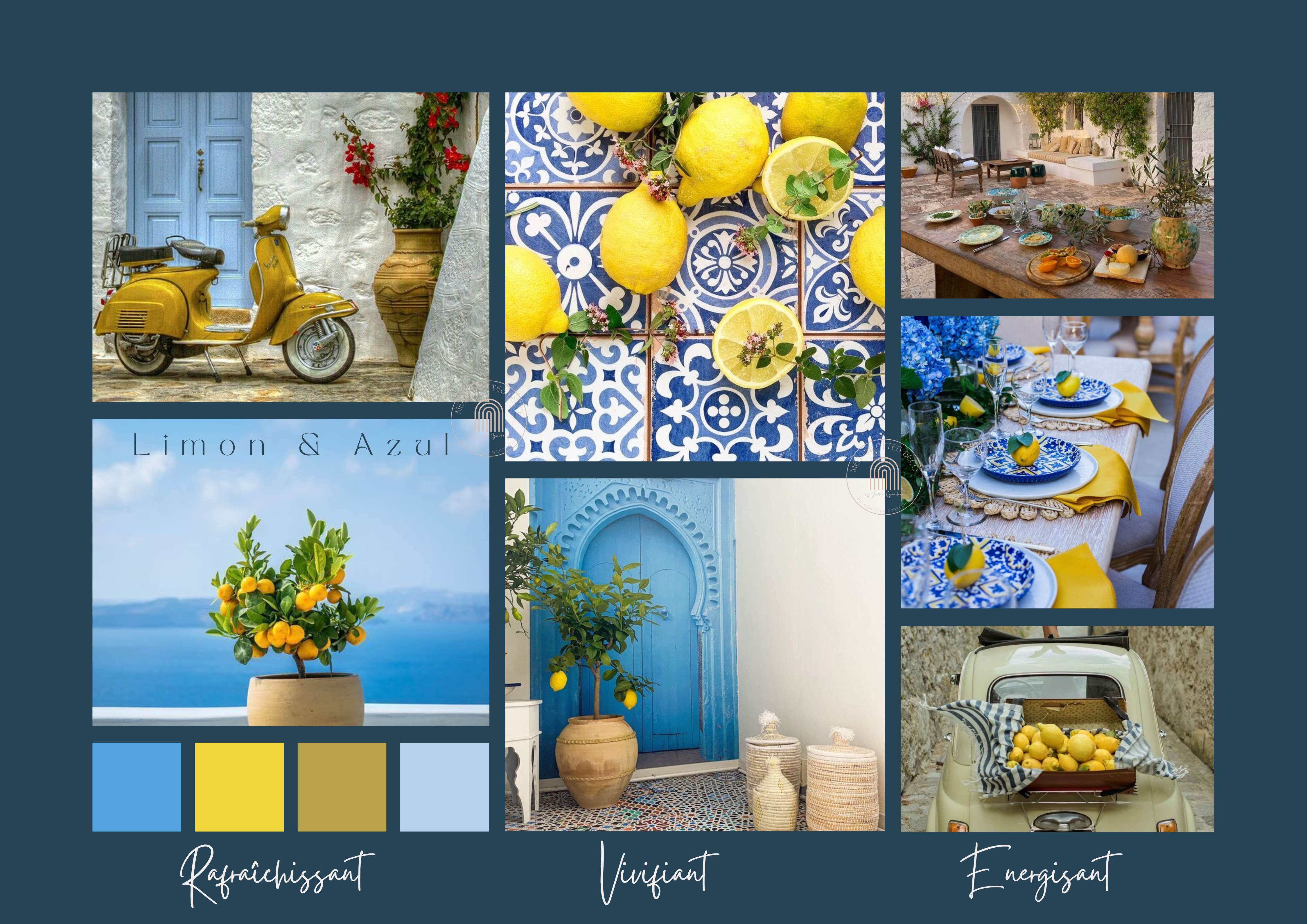 « Dans mon exploration constante des palettes de couleurs, j’ai opté pour un mariage audacieux de jaune et de bleu, inspiré par la vitalité du citron et la profondeur de l’azur.